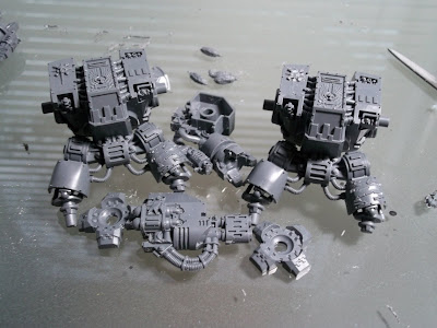 Back with the Space Wolves, I've got about twenty Grey Hunters, five Fenrisian Wolves and three Thunderwolf Cavalry to start on, and two dreadnoughts. I got an Assault on Black Reach box from eBay which somehow ended up with a couple swapped out sprues so I ended up with two dreadnoughts instead of the standard one. What I've decided to do with them is create the dreadnoughts as Geri and Freki, Leman Russ' two pet thunderwolves.