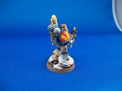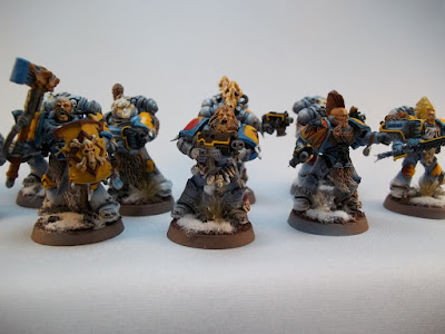 It took me a while, but my latest Space Wolves are complete! Overall, they're not bad as I attempted a variety of techniques on them. I guess you could say they were my guinea pigs for painting! I also spruced up the bases for these a bit, using some cork for stones and the powdery stuff (Army Painter?) for snow. Up close, they don't look so great as snow, if anyone has any suggestions for the snow I'm open to anything.